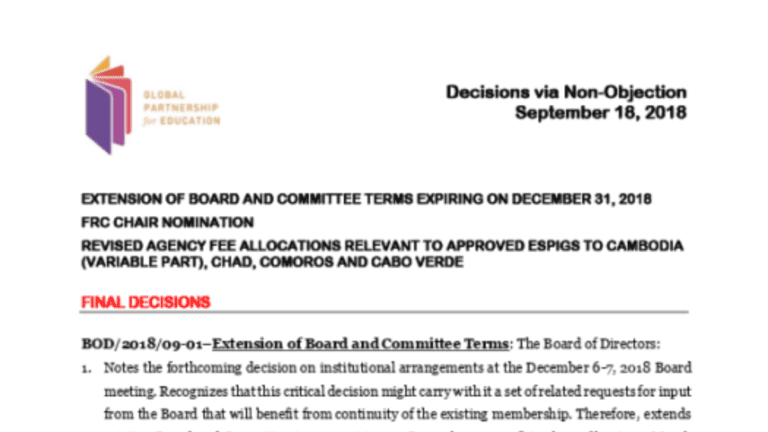 Description: The Board of Directors made decisions on the extension of the Board and Committee terms expiring in December 2018, on the FRC chair nomination, and on the revised agency fee allocations for grants to Cambodia, Chad, Comoros and Cabo…