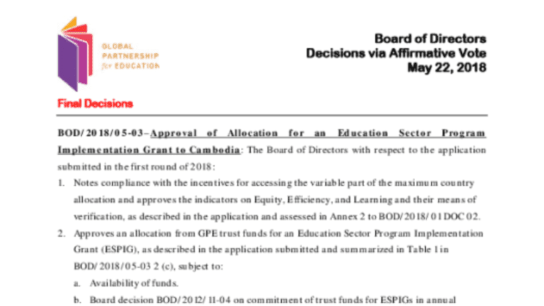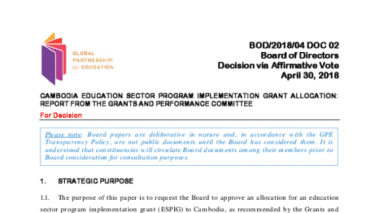 Description: The purpose of this paper is to request the Board to approve an allocation for an education sector program implementation grant (ESPIG) to Cambodia, as recommended by the Grants and Performance Committee (GPC) following its discussion of the grant…