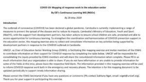 To strengthen the coordination and harmonization of COVID19 prevention support in the education sector, this mapping exercise aims to collect and consolidate information on key activities being supported by development partners in response to the COVID19 outbreak in Cambodia.